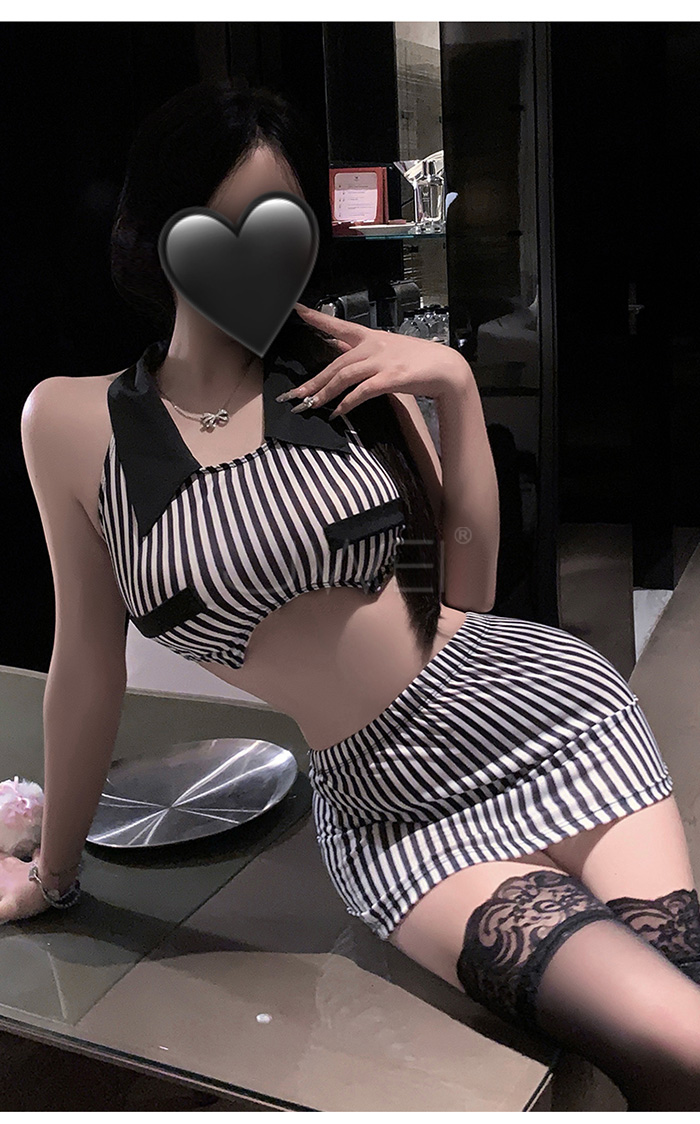 首頁>純欲秘書.條紋裹胸放大胸型露腰美背包臀秘書套裝【上衣+包臀裙+T褲】