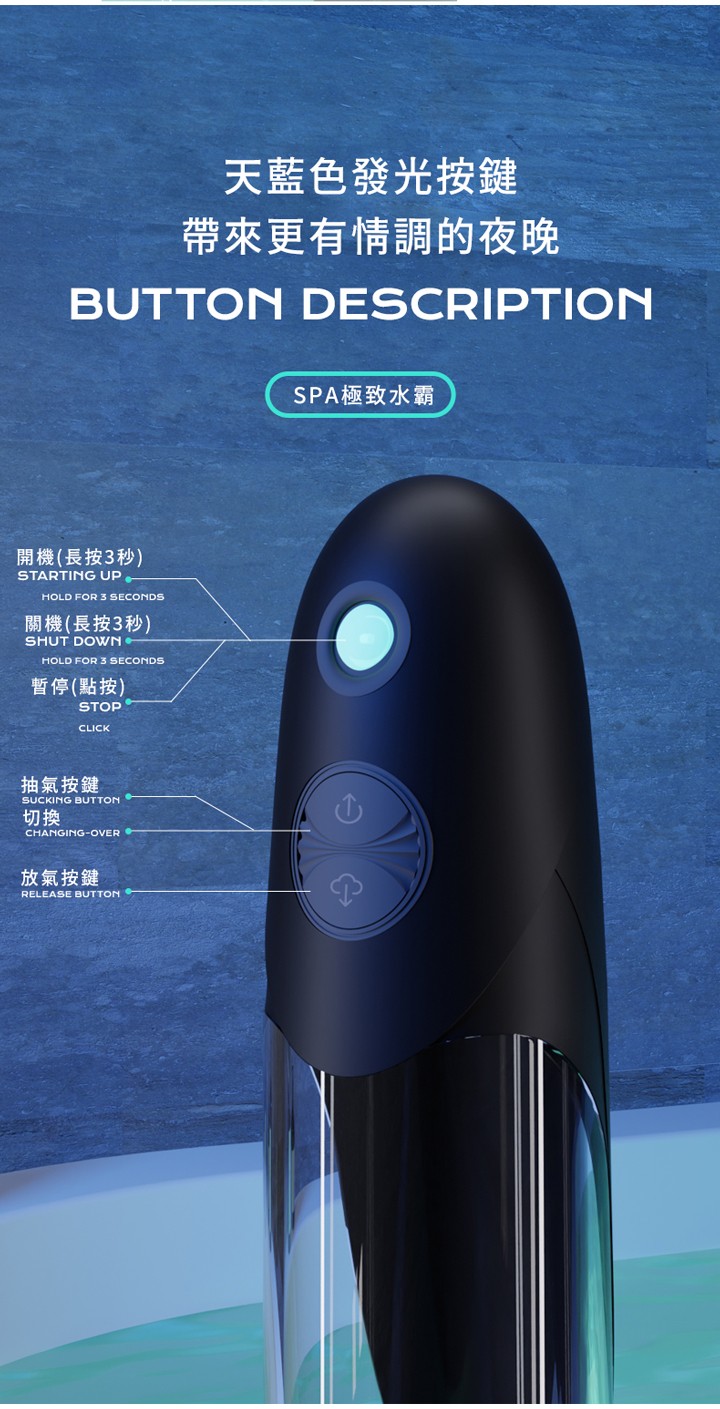 - 使用方法:將陽具放入幫浦後,啟動開關即可