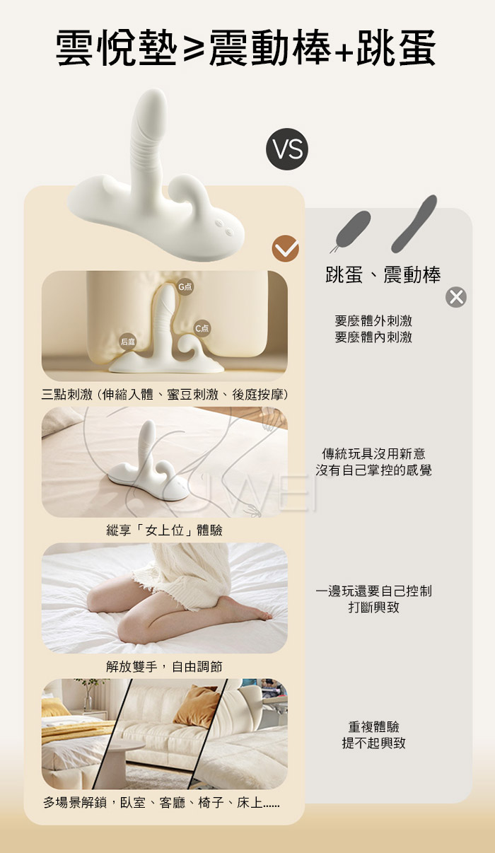 坐入雲深處~雲悦墊智能伸縮震動按摩墊,無處不可坐,隨坐皆生歡樂 深入!更深入!!節奏由你掌控,搭載伸縮+震動雙重結構 前後配置雙馬達,一震一動之間,把「快感」升為身體的旋律 ■尺寸:大小詳如圖片標示 ■材質:矽膠+ABS ■功能:9頻震動、9種伸縮、無線遙控