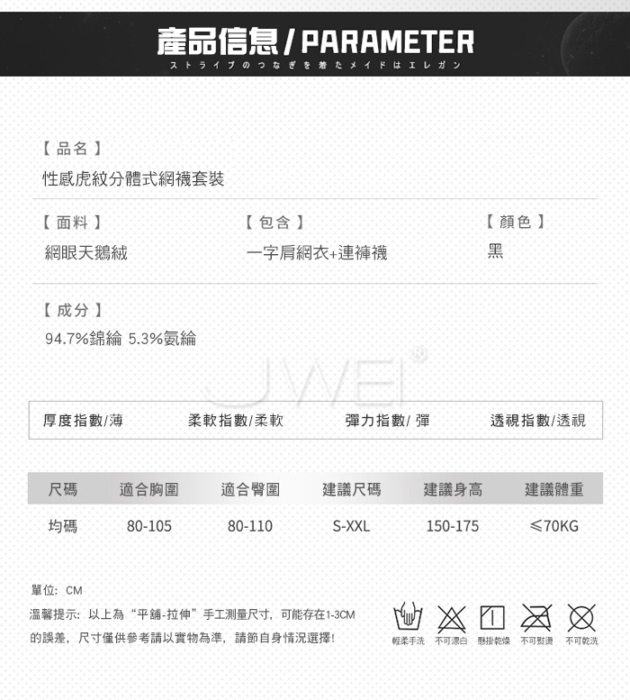 ►您現在的位置:首頁>野性美學.性感虎紋一字肩環飾透胸分體式露腰網襪套裝【一字肩網衣+連褲襪】