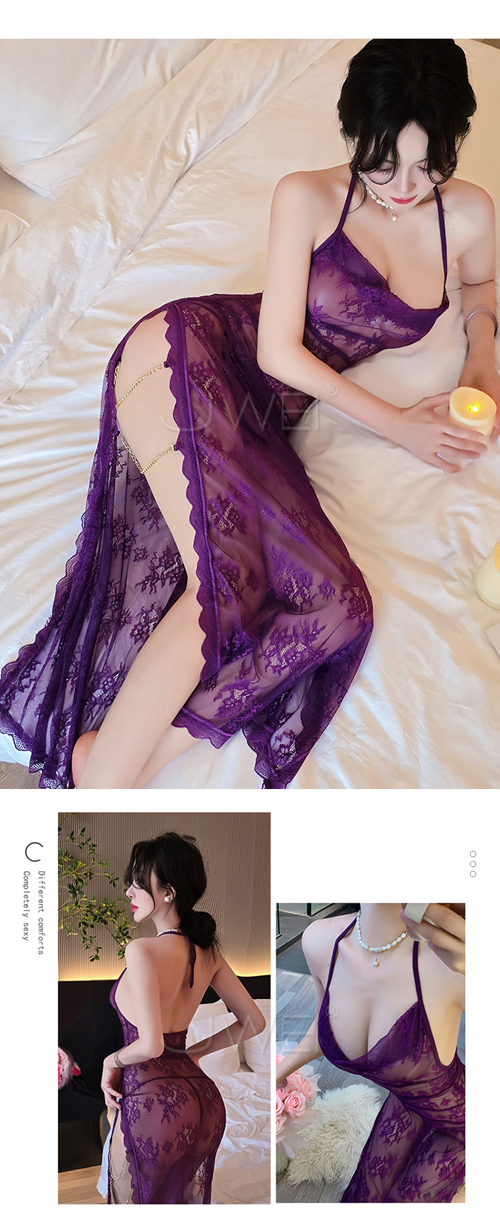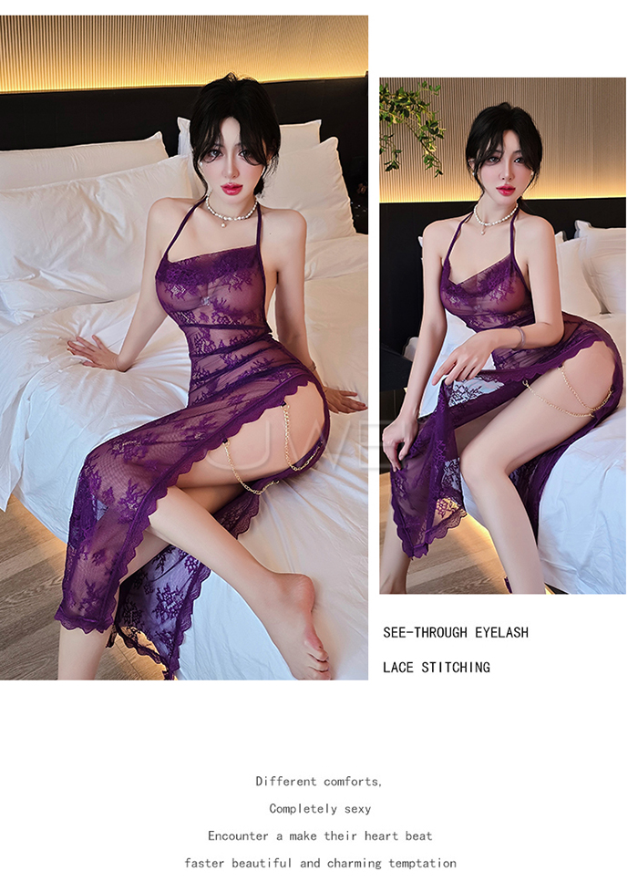 ►您現在的位置:首頁>柔欲佳人.蕾絲蕩領美背半露兩側開衩透視睡裙-紫色【連衣裙+T褲】