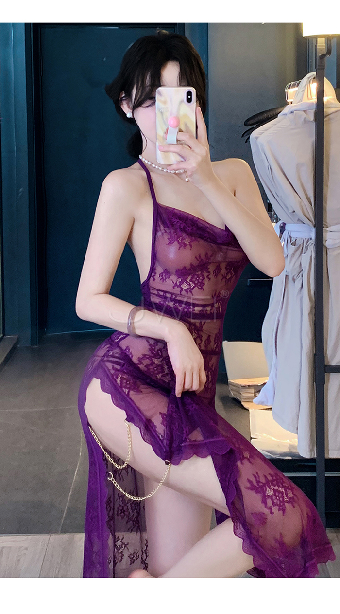 柔欲佳人.蕾絲蕩領美背半露兩側開衩透視睡裙-紫色【連衣裙+T褲】