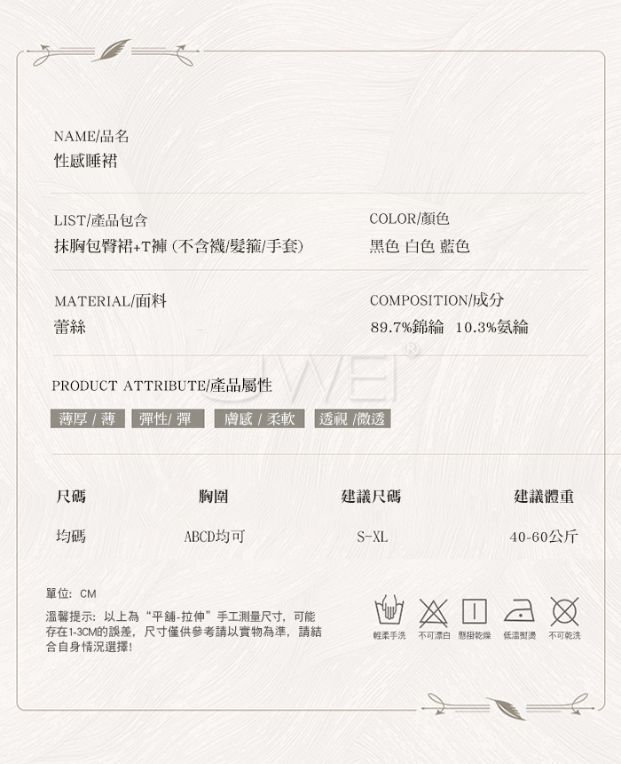 2.基於保障消費者個人衛生,情趣衣物類恕不接受退換貨,如為商品本身暇疵,接受三日內換貨,請勿試穿。