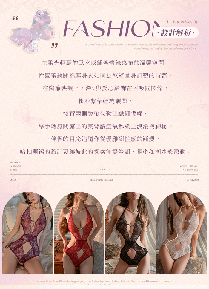 ►您現在的位置:首頁>繁花似錦.深V愛心鑽飾露胸掛脖繫帶美背蕾絲開襠連體衣【白色】