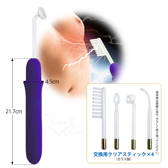 日文簡述: 新体験! 快感と官能のパルスショック! 4種の機能別アタッチメントから放たれる6段階パルスの 刺激的な快感に痺れる! 使用箇所の説明とご注意 ■敏感度の高い部分…舌、乳首、外陰部、つま先など ■中程度の敏感度の高い部分… 首、胴体側面、胸部、腹筋、内腿、足裏 ■敏感度の低い部位…胸部、背中、腕、その他の太もも、臀部 《使ってはいけない部分》 眼球、外耳道、傷口、尿道、肛門など、敏感な部位への接触はおやめください。 また、医療機器(ペースメーカーなど)をご使用の方、妊娠中の方、高血圧、心臓病、 その他の特別な疾患をお持ちの方は、本製品を使用しないでください。 使用中に異常を感じた場合は、直ちに使用を中止してください。 《使い方》 ご使用前に、水性潤滑剤で肌を湿らせるか、ウェットティッシュで肌の表面を時々拭いてください。 (乾燥した肌は抵抗力が高くなるため。) 用意ができたら、クリアスティックを本体に差し込んで、電源スイッチを長押しし、本体をスタンバイ状態にします。、 その後、+と-で、高周波6段階の強弱を調整しながら、パルスの刺激を操作します。 やけどを防ぐため先端を同じ個所に長時間当て続けず、先端をちょんちょんと肌に当てるクイックコンタクト法、 先端を肌にあて、スッと撫でるスライディングコンタクト法の併用をおすすめします。 終了するには再度電源スイッチを長押しし、本体をシャットダウンさせてください。 ※1…この様なパルストイを初めてご使用になる場合は、まず最弱パルスを手の皮膚でテストしてください。 ※2…腕、太もも、お尻など、敏感でない部位は、最小パワーから刺激を始め、じょじょにパルスの強度を調整してください。 《本体の充電》 ■付属の充電ケーブルのピン先を本体底の小穴に差しこみ、もう一方はスマホ充電器やPCなどのUSB口(Type-A)に差し込むと 充電を開始します。充電中は電源スイッチが点滅、満電になると点灯に変わります。 ■充電時間:約90分 ■連続使用時間:約60分 《本体の取り扱いについて》 クリアスティックはガラス製ですので、取り扱いにはご注意ください。 通電中は、感電を防ぐため、通電部周辺に触れないでください。 ご使用の際は、適切なパルスの強度を選択し、怪我をしないようご注意ください。
